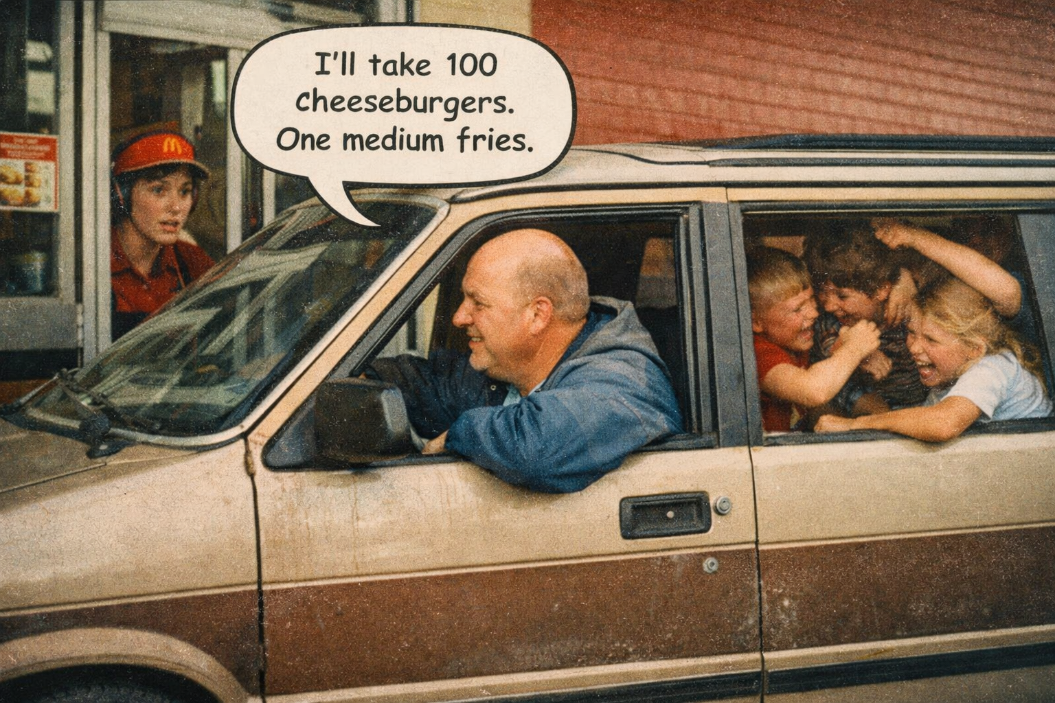 When we first moved to the U.S., he would buy 20+ McDonald’s cheeseburgers every Sunday for 19 cents and freeze them so my under-7 (year old) siblings and I could microwave them later. It wasn’t good. Sometimes there were fires, more often just unhealthy, improperly heated food by children. But it was cheap.