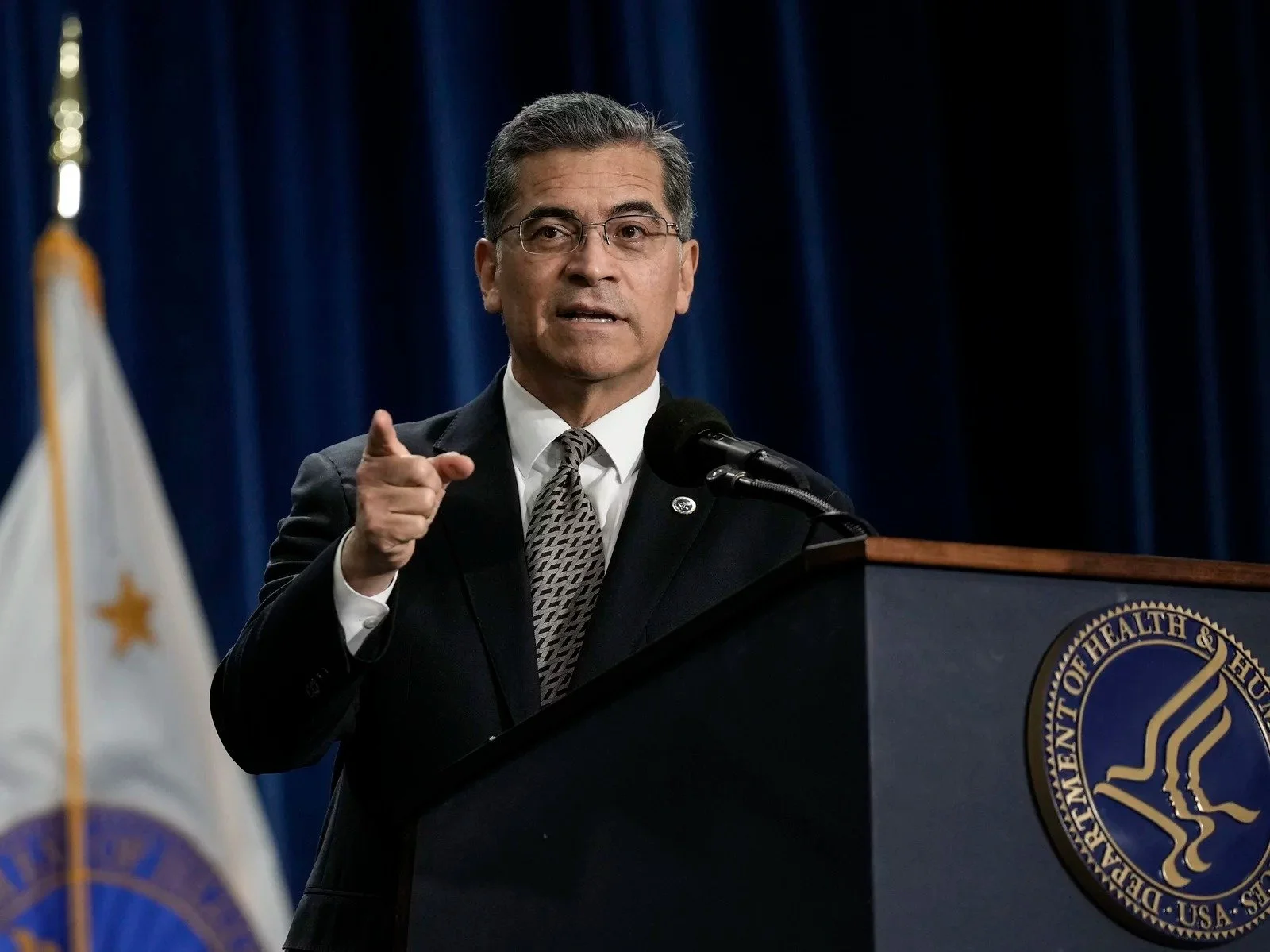 Secretary of the Department of Health and Human Services Xavier Becerra at a news conference at HHS headquarters in Washington, D.C., on March 9, 2023. Becerra said gun violence contributes to shorter lifespans in the U.S.