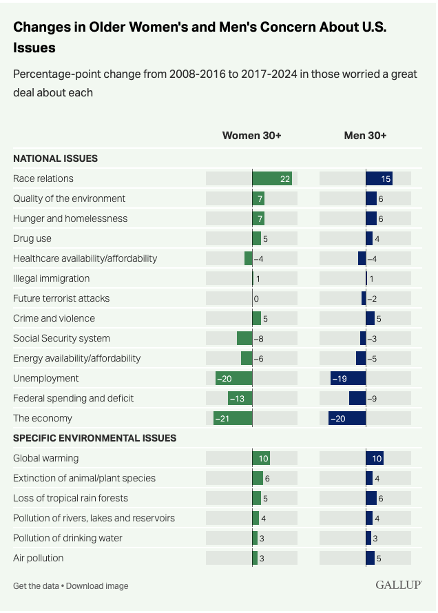 Older women are also more likely than their male counterparts to have grown more concerned about race relations in recent years, with the percentage worried a great deal increasing 22 points, versus 15 points for older men. But their concern about all other issues measured has changed at about the same rate.