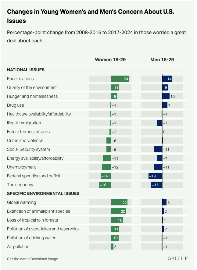 Meanwhile, young women have become moderately more concerned about the quality of the environment, generally (+11), pollution of waterways (+11) and pollution of drinking water (+10). They have grown only slightly more concerned about hunger and homelessness (+8).