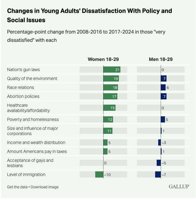 Young women’s dissatisfaction with healthcare, poverty and homelessness, and issues related to corporations has risen more modestly. There has been no meaningful change in young women’s dissatisfaction with income and wealth distribution, what Americans pay in taxes, and the acceptance of gays and lesbians, while they have become less dissatisfied with immigration.