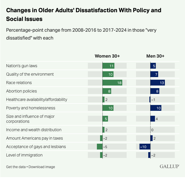 Again, the differences in recent shifts in policy positions expressed by older women are generally much smaller than those of younger women. However, race relations is an exception, as strong dissatisfaction has increased as much among women aged 30+ (18 points) as among women aged 18 to 29. As for men, dissatisfaction with these aspects of the country has increased at least as much, if not more, among older men as among younger men on most of these items.