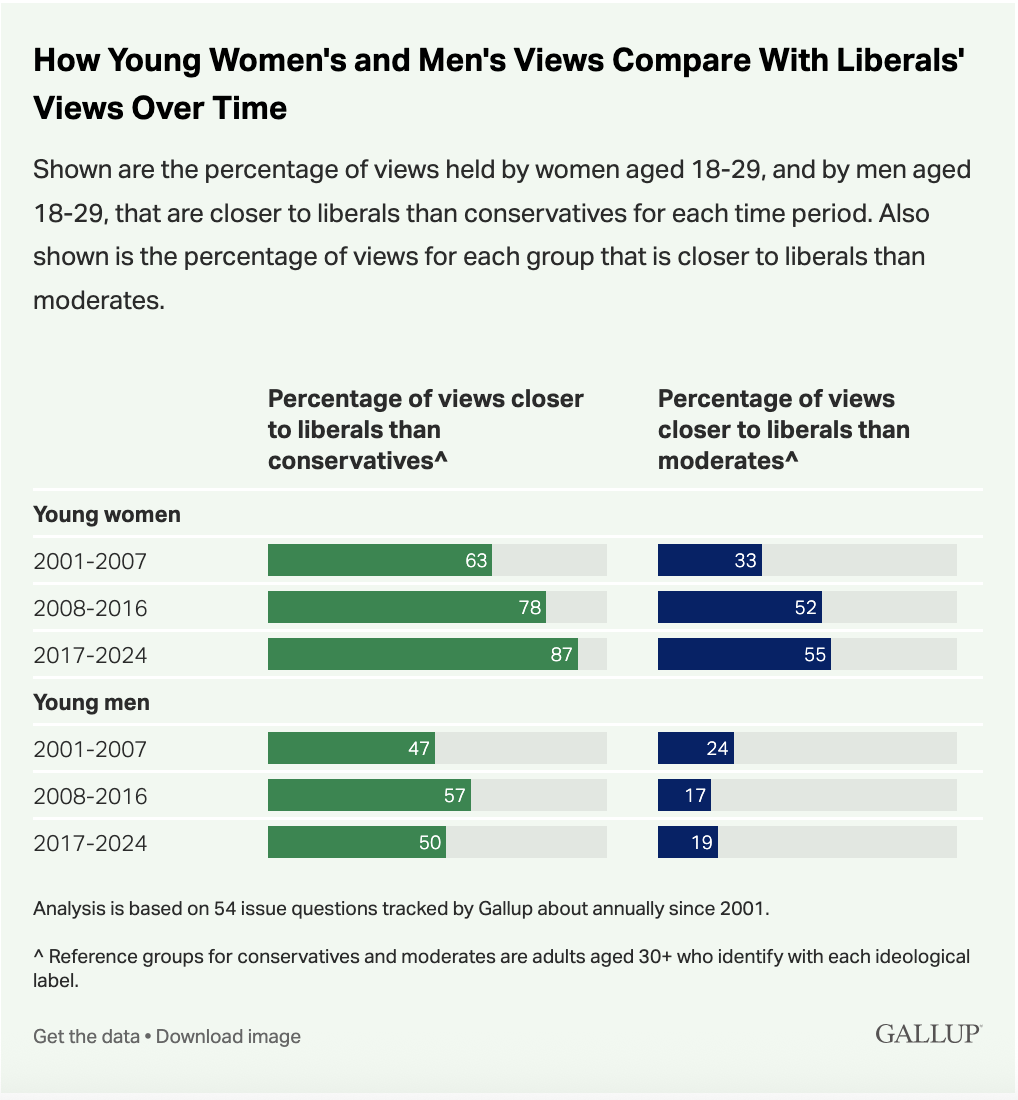 Founded in 1935, Gallup today is one of the most established public opinion research organizations. it conducts large-scale polling used by governments, academic researchers, and major media outlets to track long-term trends in political attitudes, social values, and institutional trust. Read the 2024 Gallup analysis below, or directly on their site: https://news.gallup.com/poll/649826/exploring-young-women-leftward-expansion.aspx