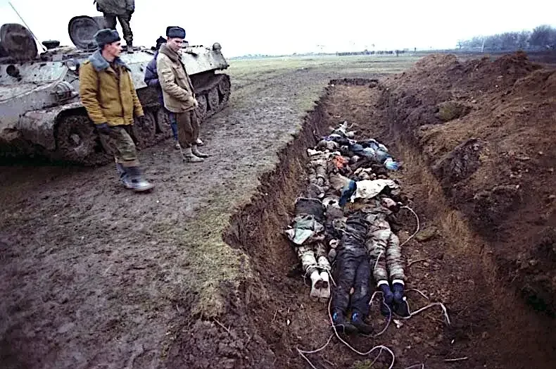 Russian troops next to a mass grave in Chechnya, February 2000. Source: Wikimedia Commons.
