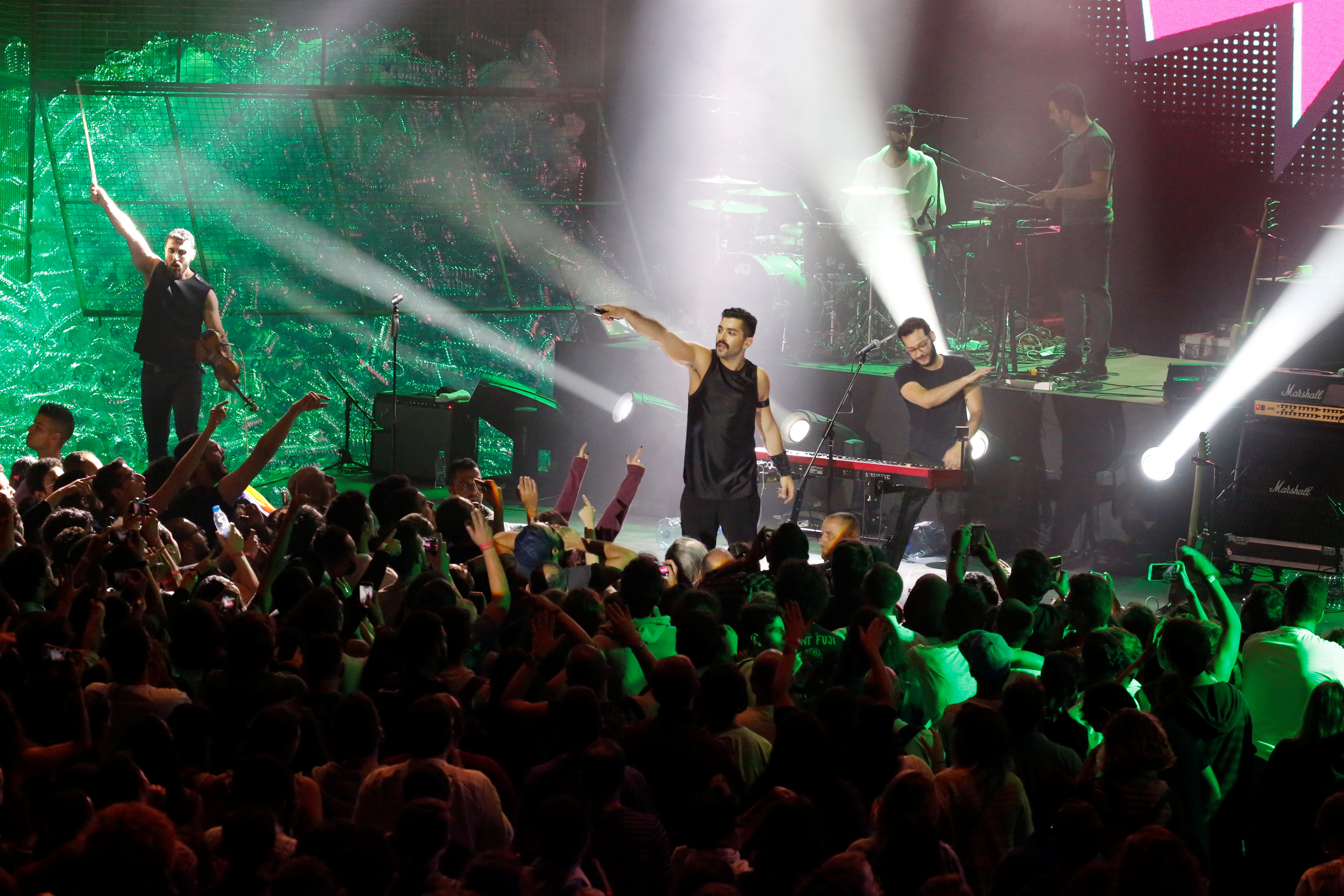It was a beautiful night for Mashrou’ Leila. Over 35,000 concertgoers showed up to see the Lebanese band and two other Arab rock groups perform at the daylong Music Park Festival in an upscale suburb of Cairo, Egypt, late last September. During their set, spotlights glittered in carnivalesque colors and mega-screens displayed images of a woman wearing a hijab doing interpretive dance – a clip from the music video for their popular song “Roman” – as they strutted through their funky, violin-adorned, socially-engaged indie rock.