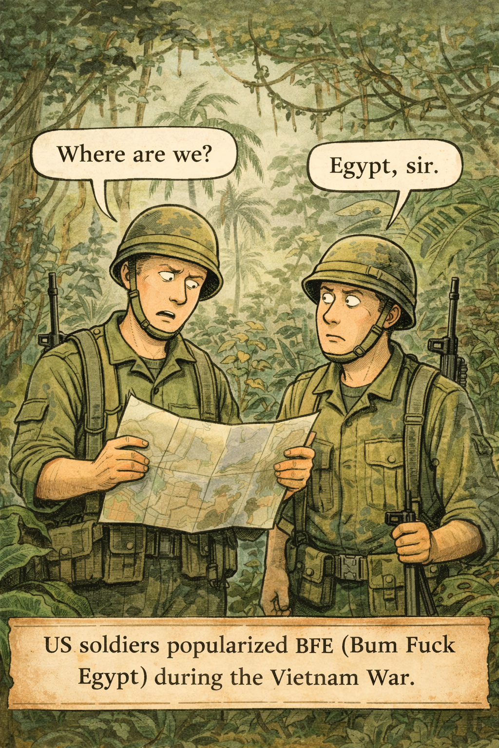 The phrase BFE (Bum Fuck Egypt) originated in United States military slang in the late 1960s and early 1970s, during the Vietnam War era. Soldiers used it to describe remote bases or postings located far from any major city.