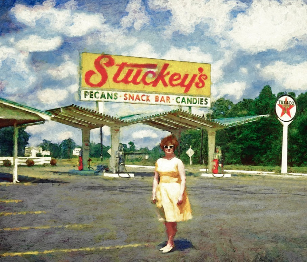 Image origin unknown, but found in a thrift store box with old Kodachrome images, taken from: https://www.fineartmarketplace.com/stuckeys-corporation/art_print_products/yeehaw-junction-painting