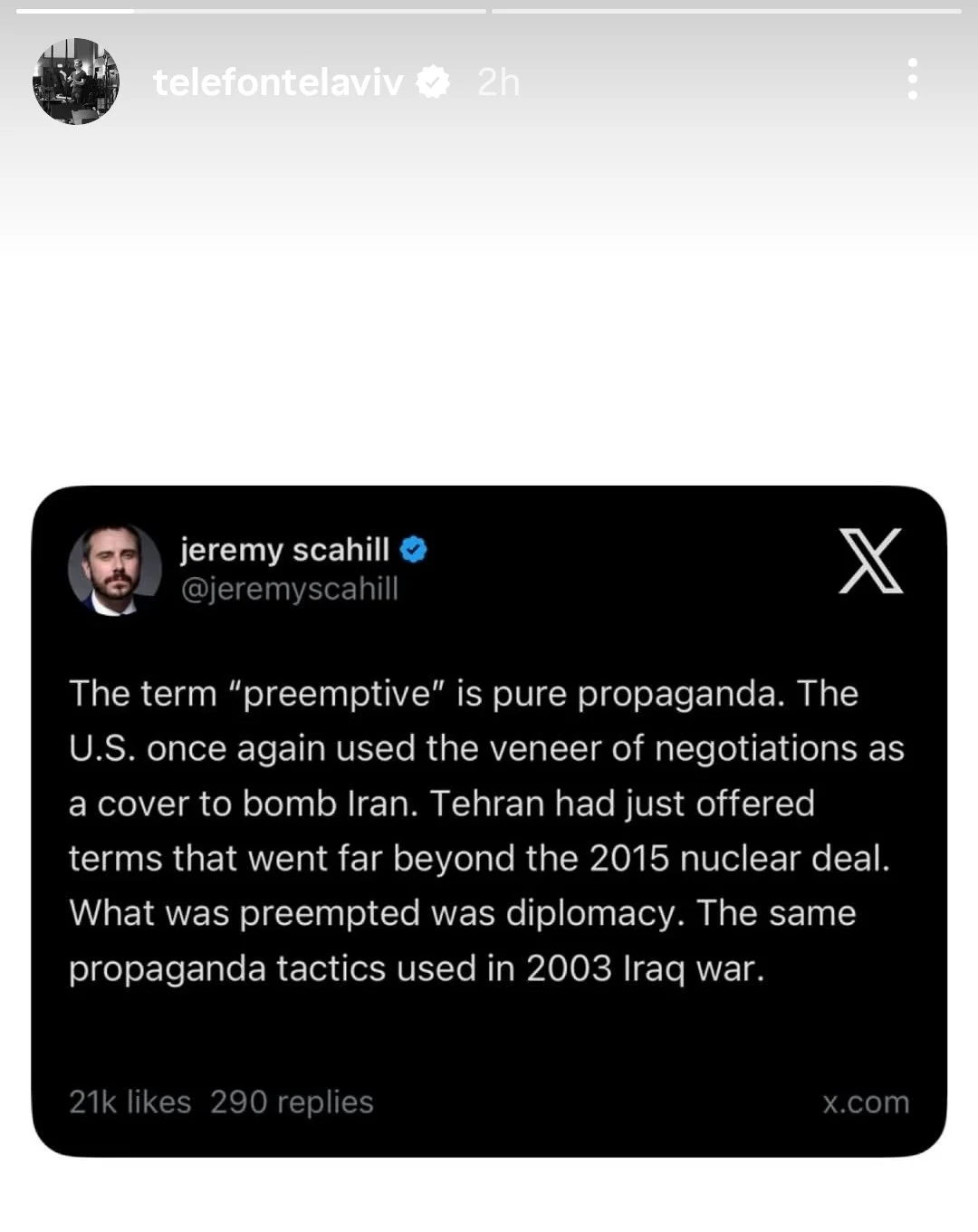 Today, Joshua Eustis reposted something I can't look past: outright lies to attack the US and Israel for finally intervening in what they should have stopped six decades ago, back when the US had patriotism, back when people cared about the rights for women to show their hair and the LGBT+ representatives didn’t downplay Iran’s forced transitions. It was a tweet by Jeremy Scahill, a political commentator known for his strong criticism of US. Scahill, exactly like Tucker Qatarlson and Candace Owens, call it anti-interventionist to ignore Islamofascists and Russia’s invasion of Ukraine. For these people, obsession over US and Israel, but especially engagement, is far more important than artistry.