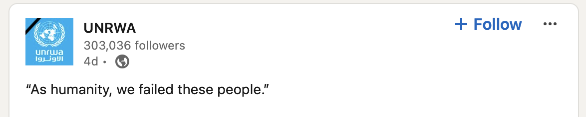 An UNRWA post claiming “humanity” failed Gaza rather than take any accountability. Their staff partook in October 7. UNRWA failed, not humanity.