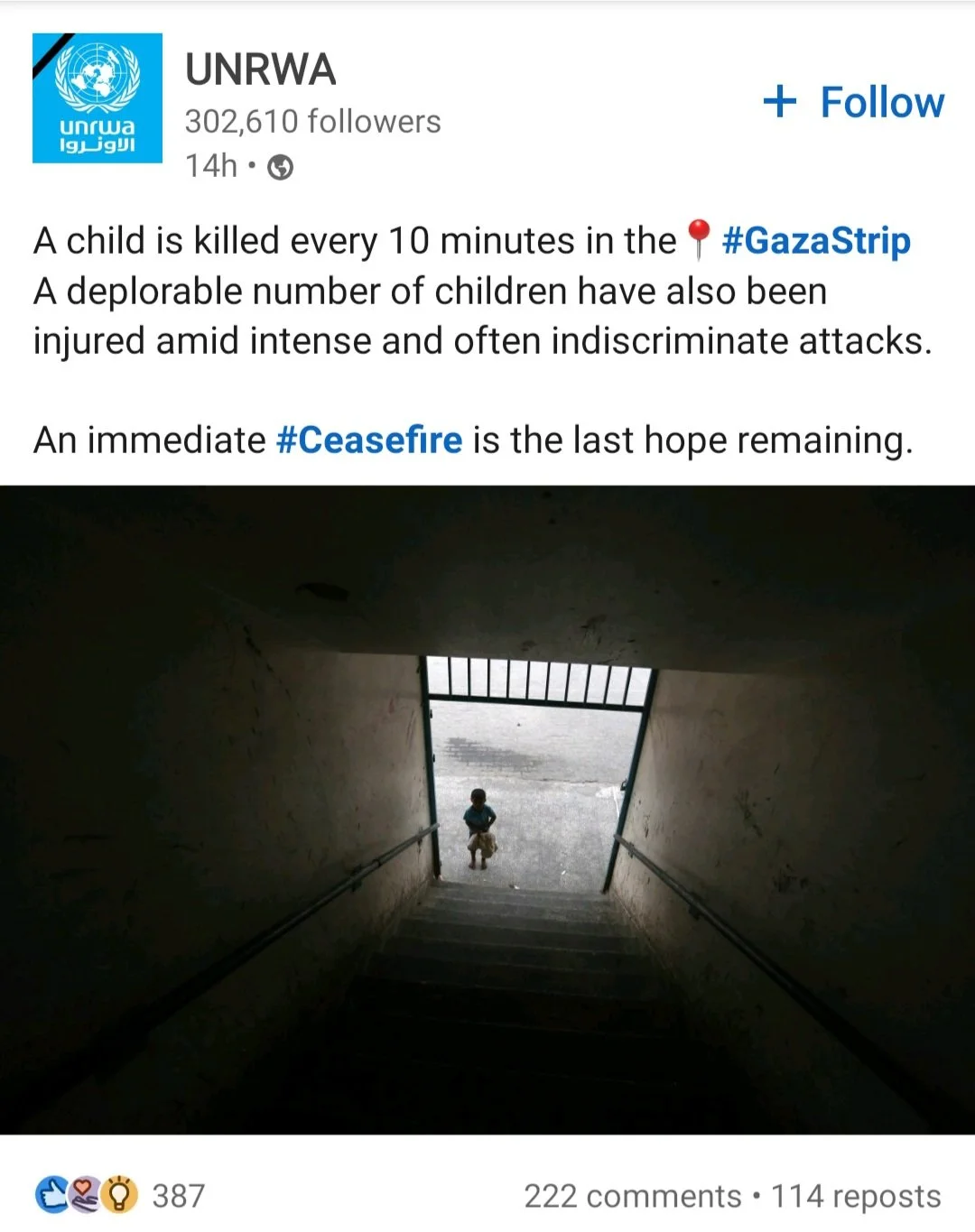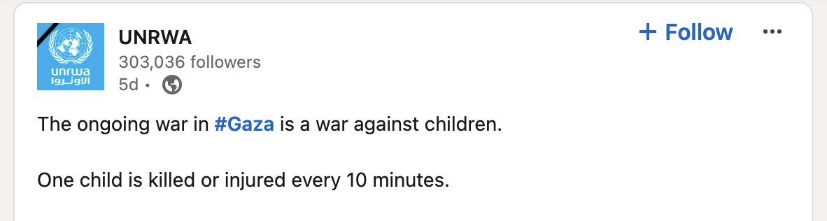 Last month, Gaza’s Ministry of Health clarified that 11,000 of their 33K deathtoll are unverified, and that the numbers are based on a Google Form. Not only has UNRWA consistently reported absurd numbers, they repeat a lie that “One child is killed or injured every 10 minutes.” This is simply a lie.